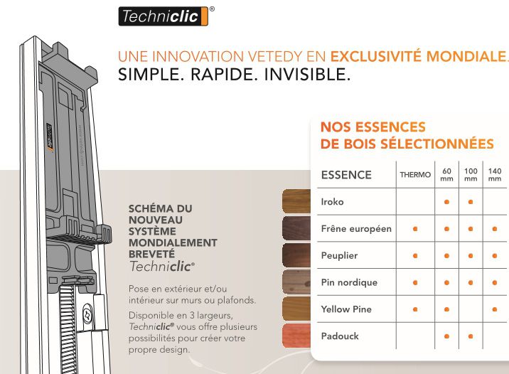 Le système Techniclic® reprend tous les avantages de son grand frère, le système Softline®, avec toutefois une technique supplémentaire et ingénieuse permettant la pose en vertical de façon ultra-rapide, en utilisant un minimum de vis de fixation et en garantissant une longévité exceptionnelle.